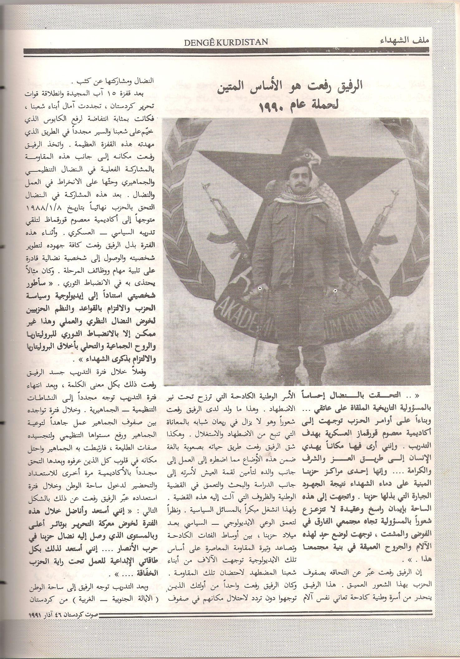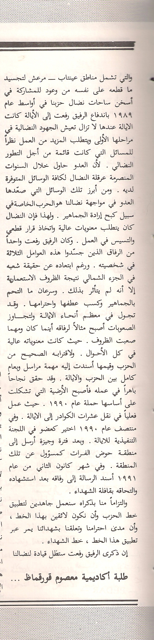 عهداً لك أيها الشهيد رفعت أن نتابع مسيرتك النضالية حتى آخر رمق من حياتنا، لتحقيق العدالة والمساواة وبناء المجتمع الديمقراطي الحر.