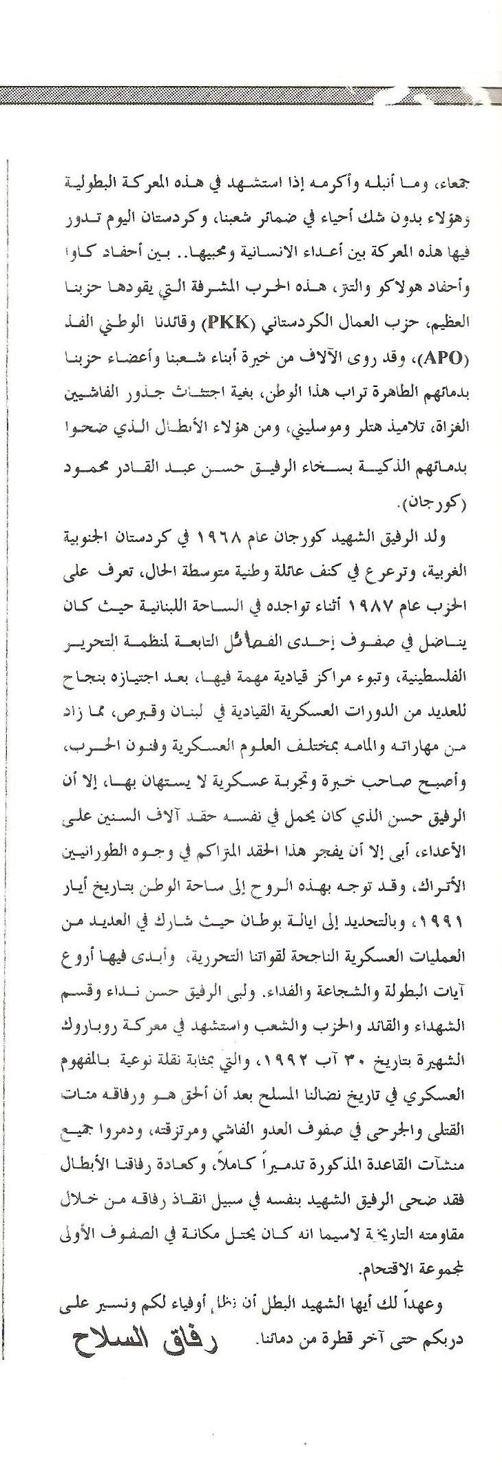 عهداً لك أيها الشهيد كورجان أن نتابع مسيرتك النضالية حتى آخر رمق من حياتنا، لتحقيق العدالة والمساواة وبناء المجتمع الديمقراطي الحر.