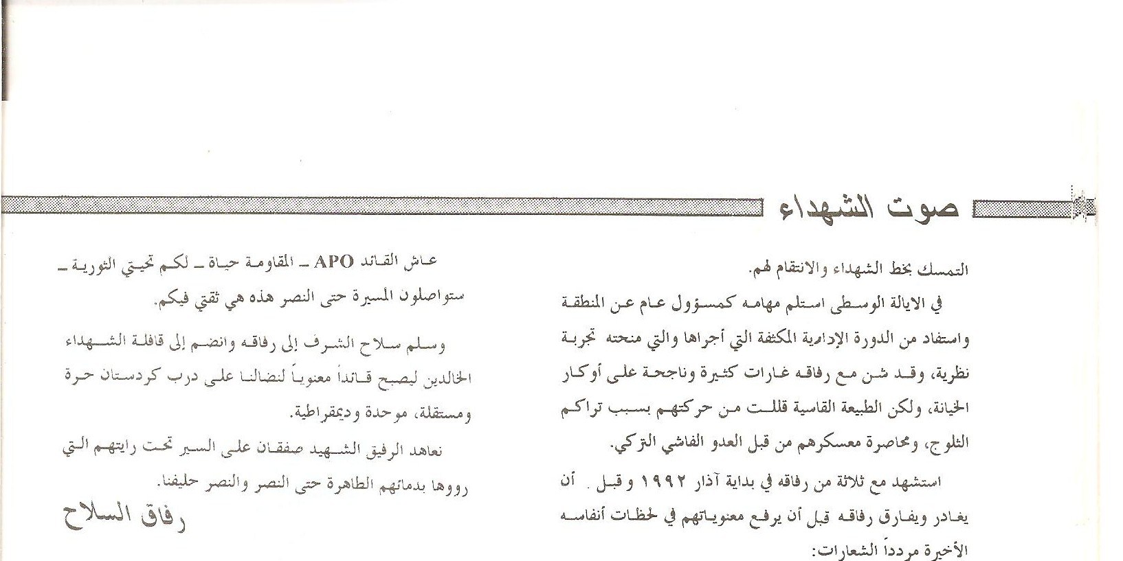 شهداؤنا هم الأصحاب الحقيقيون للحرية والبناء الديمقراطي في كردستان، ناضلوا جنباً إلى جنب في سبيل تحقيق الأخوة والتحرر، ونالوا مرتبة الشهادة ليصنعوا أسس كونفدرالية الشرق الأوسط الديمقراطي.