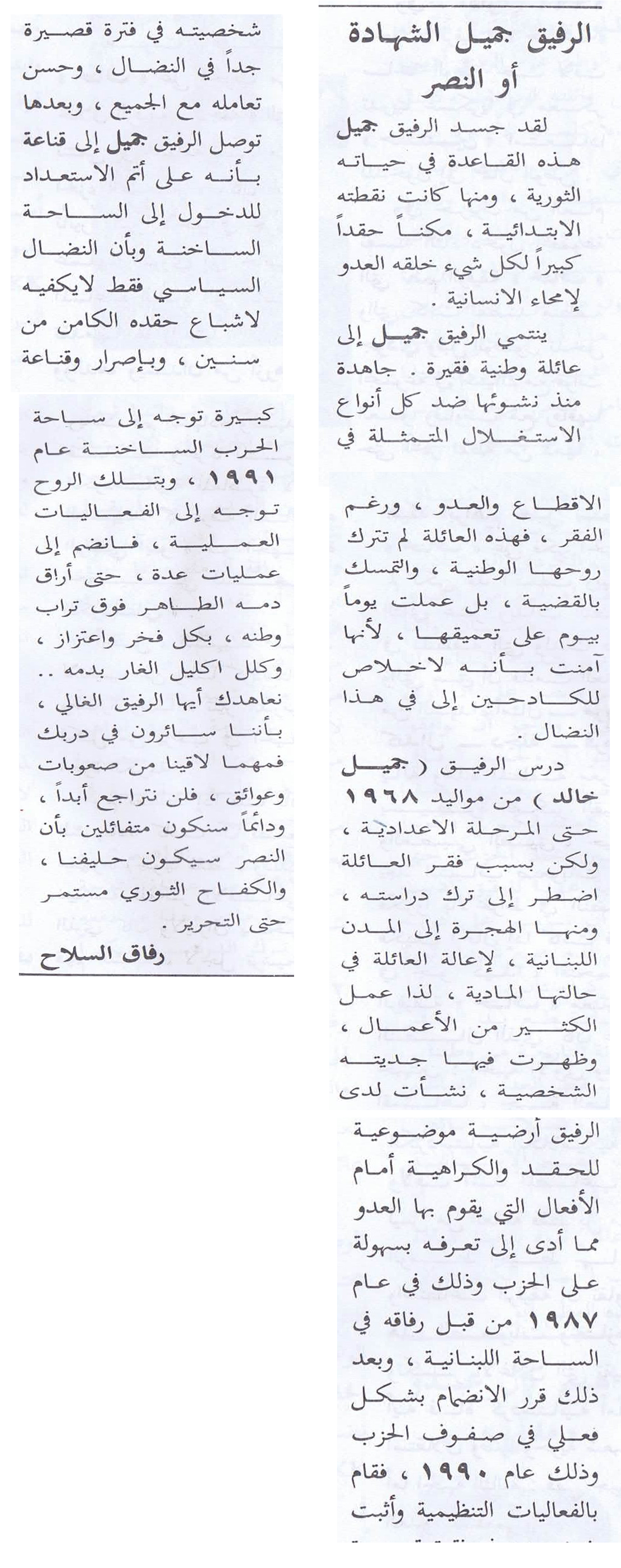 عهداً لك أيها الشهيد جميل خالد أن نتابع مسيرتك النضالية حتى آخر رمق من حياتنا، لتحقيق العدالة والمساواة وبناء المجتمع الديمقراطي الحر.
