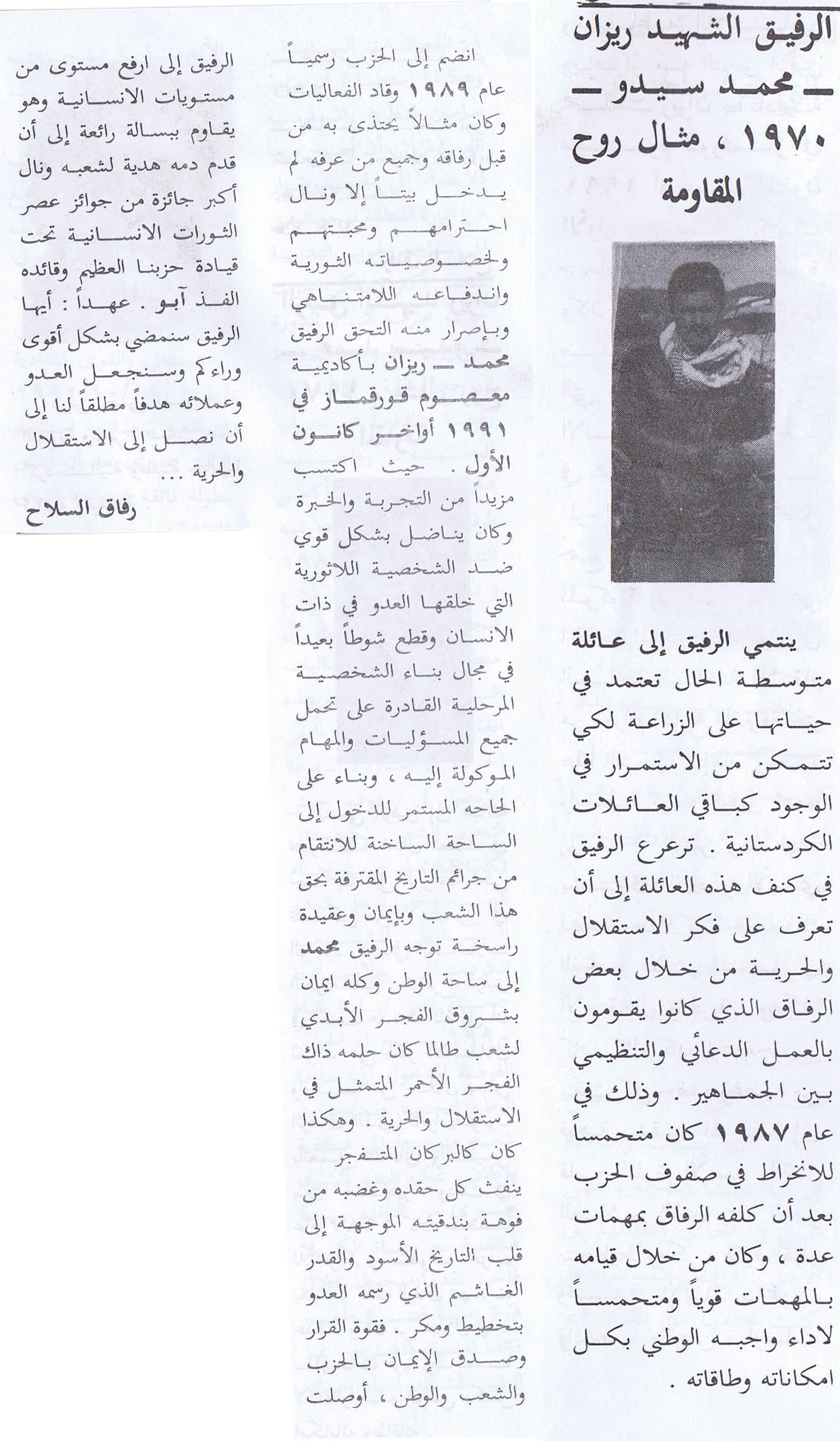 عهداً لك أيها الشهيد محمد سيدو أن نتابع مسيرتك النضالية حتى آخر رمق من حياتنا، لتحقيق العدالة والمساواة وبناء المجتمع الديمقراطي الحر.