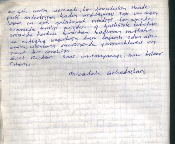 عهداً لك أيتها الشهيدة آفدار أن نتابع مسيرتك النضالية حتى آخر رمق من حياتنا، لتحقيق العدالة والمساواة وبناء المجتمع الديمقراطي الحر.